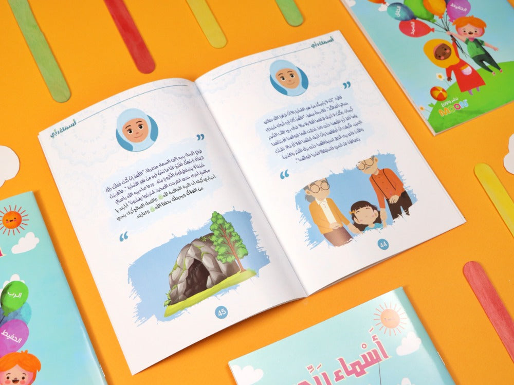 بجانب قصص حياتية واقعية للأطفال بمواقف تربوية بيتعلم منها إزاي يدعو الله عزوجل وبتعبّد بالاسم المناسب وإزاي يتصرف